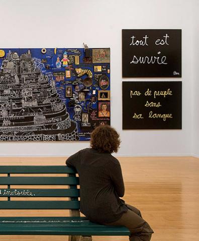 Un podium installé à cet étage permet aux visiteurs qui le souhaitent de s'exprimer en vidéo sur la phrase "pas d'art sans provocation".